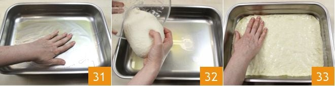 While the pissaladière topping cools, grease a baking tray measuring 14x10 inches, using your hands or a brush 31. Take the dough, which will have risen in the meantime, and transfer it to the oiled tray 32, then press it with your fingertips from the center to the sides, until it covers the entire surface 33.