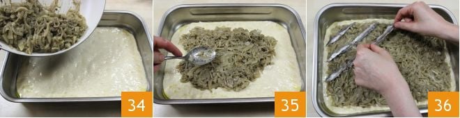 Now pour the topping over the dough you have spread 34 and spread it evenly with the back of a spoon 35, remembering to leave a ¾ inch border. Start decorating the pissaladière with the remaining anchovy fillets: create diamonds by arranging the anchovies diagonally 36.