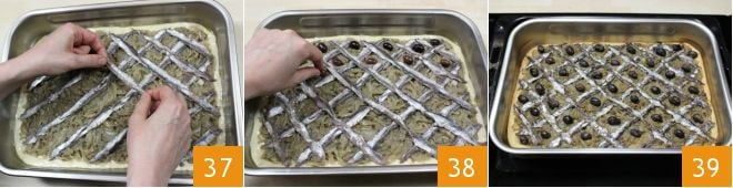 Continue forming the diamonds starting from the opposite corner to where you started, completing the grid 37. Place the black olives in the spaces between one strip and the other 38 and bake in a preheated static oven, on a hot baking sheet, at 428°F for about 25 minutes. When the edges are golden and crispy 39, the pissaladière will be ready to be served as an appetizer, perhaps accompanied by a good chilled white wine!
