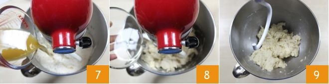 Add the water, malt, yeast, and oil solution to the flour 7 and start kneading at medium speed using the paddle attachment on the stand mixer or with your hands to gather the ingredients. After 1 minute, also add the water with the salt while continuing to knead 8. When all the ingredients are gathered around the paddle, replace it with the dough hook 9 and continue kneading at medium-low speed for at least 5 minutes, until the mixture is smooth and homogeneous.