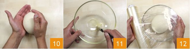 Work the dough with your hands, giving it a spherical shape 10, pour a drizzle of oil into a bowl and brush it with a brush 11. Then place the dough in, cover it with plastic wrap 12 and let it rise for at least 2 hours at room temperature (around 82-86°F), until it doubles in volume.
