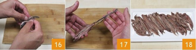 When the anchovies have softened, open them in half 16 and remove the insides with the central bone 17. Then line a small tray or baking sheet with absorbent paper and place the opened fillets on it 18. In the end, you will get about 150g of desalted anchovies.
