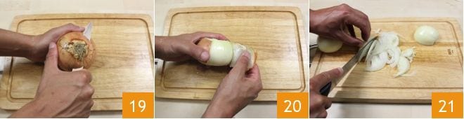 At this point, prepare the topping for the pissaladière: clean the onions, removing the stalk 19 and peel the outermost layer with the skin 20. Then cut them in half and slice thinly 21.