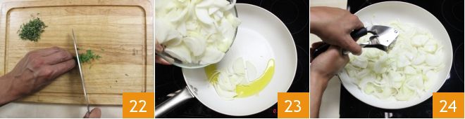 Place the thyme and bay leaves on a cutting board, chop finely 22, and set aside. Then heat the oil in a non-stick pan and, once hot, add the sliced onions 23. Also, add 2 crushed garlic cloves using a garlic press or the prongs of a fork 24.