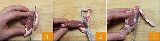 To prepare the pistachio crusted lamb chops, first clean the chops by removing all the fat around the meat from both sides (1-2), and clean the protruding bone well with a small knife, scraping off all the cartilage around it 3.