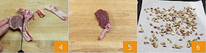 Remove the final part of the bone (the one attached to the meat) 4, using a knife, to get a tender morsel of lamb attached to a thin chop 5. Prepare all sixteen chops this way. To save time, you can ask your trusted butcher to prepare 16 pre-cleaned chops for you. Roast the pistachios on a baking sheet lined with parchment paper for a couple of minutes in a preheated oven at 392°F 6.