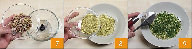 Chop the pistachios in a mixer, making sure they are not too fine 7, transfer them to a bowl 8 and add the chopped parsley and two crushed cloves of garlic 9,