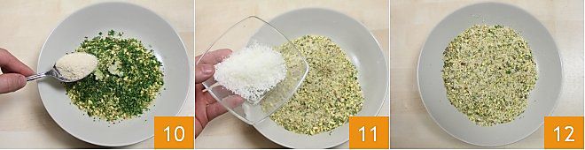 the salt and breadcrumbs 10, the grated pecorino cheese 11, and mix the ingredients well to get an even breading 12.