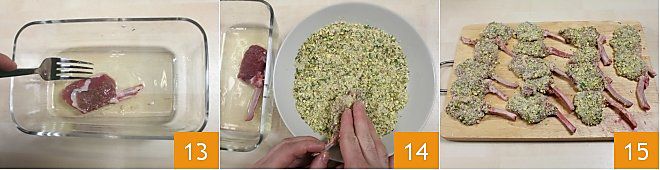 Dip the chops in the egg white 13, one at a time, making sure to cover the entire surface of the meat, then coat them with the prepared breading 14, pressing well on all sides to get an even coating for all 16 chops 15.
