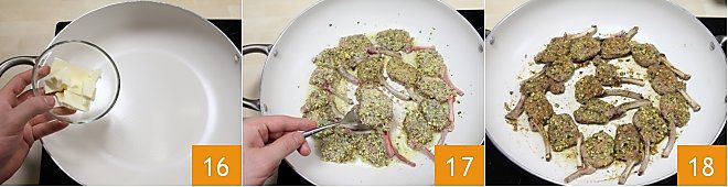 In a non-stick pan, place the butter 16 (you can also use clarified butter or olive oil if you prefer), melt it and add the chops 17, browning them on both sides for a couple of minutes per side. When your chops are golden and crispy 18, serve them immediately, accompanied by a fresh salad or roasted potatoes! Taste how delicious the pistachio crusted lamb chops are!