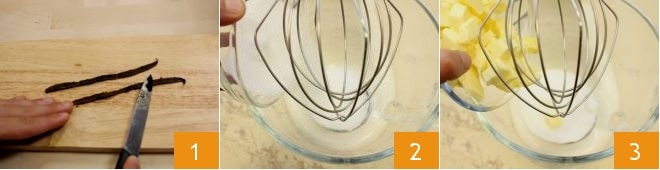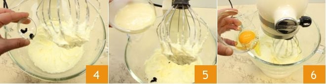 Add the vanilla bean seeds 4 to the creamy butter and sugar mixture and then the condensed milk 5; then add the eggs one at a time 6 followed by the salt.