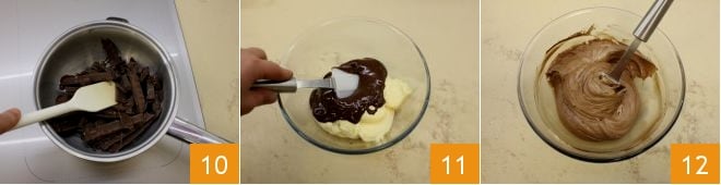 Proceed now with preparing the first mixture; roughly chop the dark chocolate with a knife and then melt it in a double boiler in a small bowl or a smaller saucepan, ensuring that the water underneath does not come into direct contact with the bottom of the container 10. When the chocolate is completely melted, let it cool and then add it to one of the two mixtures 11; mix well with a spatula 12 and set aside.