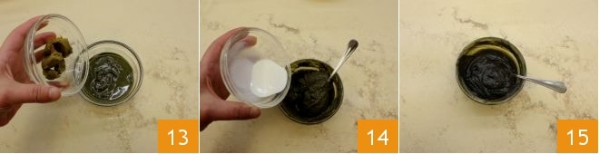 Then move on to the second mixture; put the cream and pistachio paste in a small bowl 13, stirring with a teaspoon, and in the meantime, heat the fresh cream in the microwave for 1 minute. When the cream is warmed, pour it into the cream and pistachio paste mixture 14, blending the ingredients well 15.