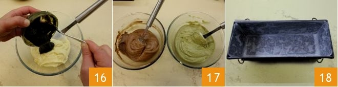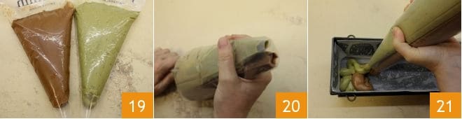 Place the chocolate and pistachio mixtures in two piping bags without a nozzle 19; place them against each other 20, and, holding them tightly together with your hands, fill the pan in a zigzag pattern with the batter to achieve the marbled effect 21. Once the first layer is complete, proceed again by reversing the colors.