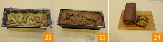 Once the batter is finished 22, bake in a preheated static oven at 338°F for 70 minutes (or in a convection oven at 302°F for 60 minutes) until the surface of the loaf cake is golden 23. Remove the pistachio marbled chocolate loaf cake from the oven, let it cool slightly, then remove it from the mold; slice it 24 and serve.