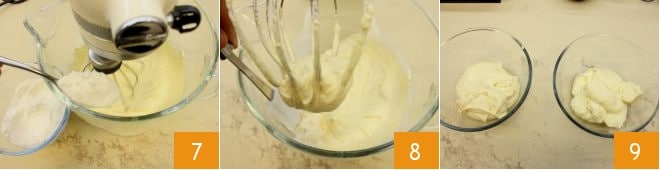 When the eggs are combined with the mixture, add the sifted flour and baking powder one tablespoon at a time 7; continue with the stand mixer, scraping down the ingredients with a spatula 8, then let everything blend until you get a thick and homogeneous mixture. At this point, divide the mixture you have obtained into two equal parts, placing them in two bowls 9.