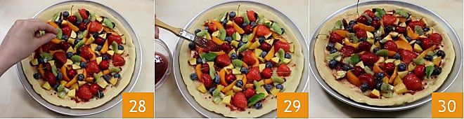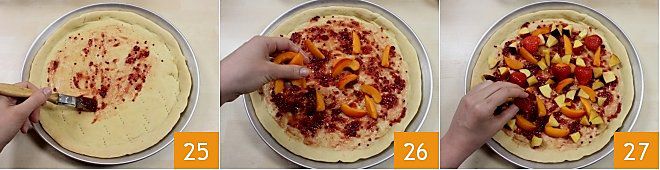 Now carefully brush the entire base of the sweet pizza with 3.5 oz of currant jam 25 that you have slightly heated beforehand to make it more liquid. Then add the fruit evenly onto the pizza, starting with the apricot wedges 26, then the peach cubes and strawberries 27.