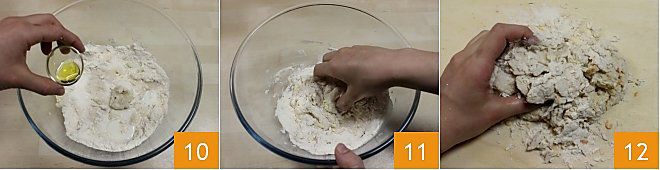 Add the oil 10 and start working the mixture by hand 11. When the liquids have been absorbed, transfer the dough to a floured work surface or board 12.