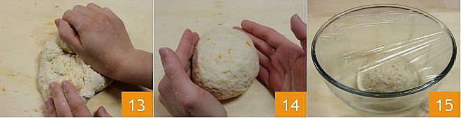 Knead vigorously with your hands 13 to obtain a smooth and soft dough with which you will form a ball 14. Place it in a bowl covered with plastic wrap and let it rise for at least 3 hours at room temperature 15.