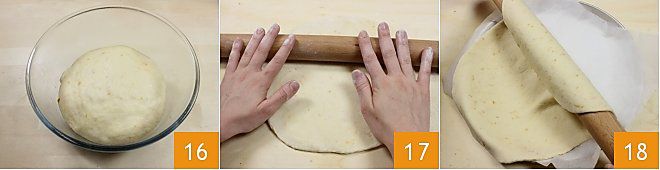 After the necessary time, the dough will have increased in volume 16. Then place it on a floured surface and roll it out with a rolling pin 17 to obtain a disc of pan brioche 0.4 inch thick and 13 inches in diameter. Take a 13-inch diameter pan and line it with parchment paper. Lay the pan brioche disc in the pan with the help of the rolling pin 18.