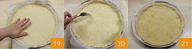 Make sure to perfectly adhere the base and edges to the mold 19. Then prick the base with the prongs of a fork 20 and bake in a preheated static oven at 356°F for 30 minutes (if using a fan oven at 320°F for 20-25 minutes). When it is cooked, take it out of the oven and let it cool slightly 21.