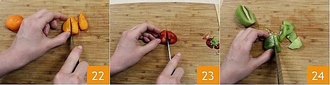 Meanwhile, start preparing the fruit to top the pizza: wash each fruit well, cut the apricots in half, remove the pit, and slice them into wedges 22. Also, cut the peach in half and dice it into small cubes; then proceed with the strawberries, removing the leaves and cutting them in half 23. Then peel the kiwi, cut it in half, and slice it widthwise 24. Finally, wash the cherries and blueberries that will also be used to top the pizza.