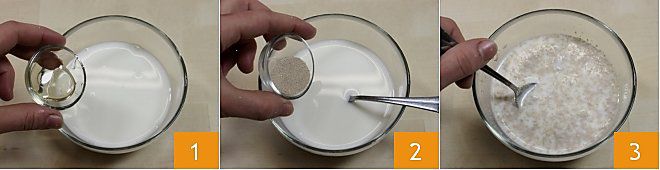 To prepare the sweet fruit pizza, start with the base: divide the portion of warm milk into 2 small bowls: in one, add to half of the milk the honey 1 and the yeast (alternatively, you can use 0.2 oz of fresh yeast) 2, stirring to dissolve them with a teaspoon 3.