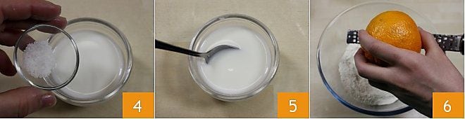 In the other small bowl with the other half portion of warm milk, add the salt 4 and dissolve it by stirring with a teaspoon 5. In a large bowl, pour the sifted flour and grate the orange zest 6.