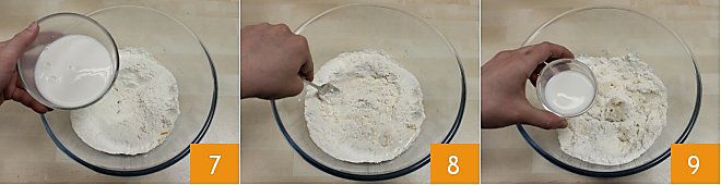 Then pour the two liquids into the bowl with the flour and grated orange zest: first add the milk in which you dissolved the honey and yeast 7, then briefly mix with a fork 8 and also pour the milk in which you dissolved the salt 9.