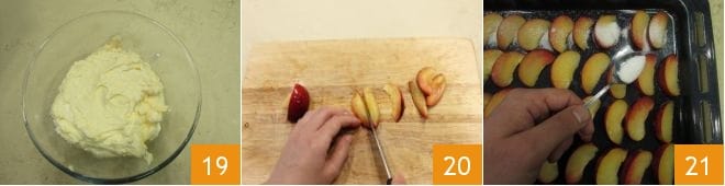 let it rest in the fridge for about an hour 19. Meanwhile, focus on the plums, so after washing and cutting them in half, remove the pit and then cut them into wedges, getting 6 from each half 20. Arrange the plum slices on a baking sheet with the 1/4 cup of sugar 21,