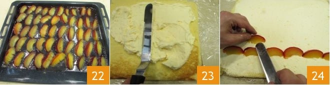 and let them caramelize at 464°F on grill function for 3-4 minutes 22. While the plums are cooling, spread the cream, which will be well set, distributing it on the sponge cake with a spatula to level it 23 and then arrange the cooked plums neatly horizontally, spacing them a couple of inches apart 24,
