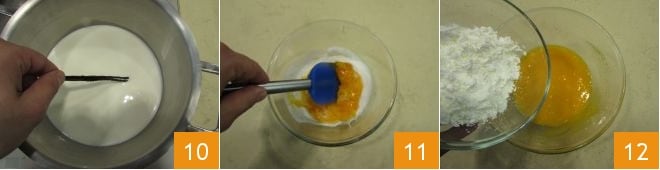 heat the milk in a saucepan and add the vanilla seeds and pod 10. As soon as it reaches a boil, remove the pod and, if desired, strain the milk through a fine mesh strainer; in a separate bowl, beat the eggs with the sugar 11 then add the starch 12 and mix,