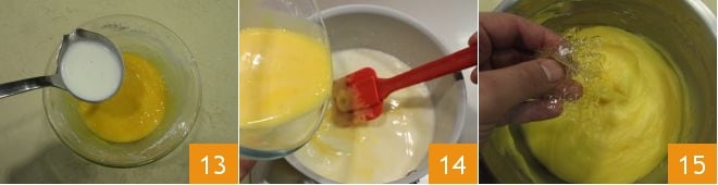 when the mixture is light and fluffy, pour in a little of the hot milk 13 and temper it, then pour it into the milk cooking pot 14, stirring continuously until it thickens. Squeeze the gelatin sheets and add them to the cream 15, again stirring well to ensure the gelatin dissolves and doesn't form lumps.