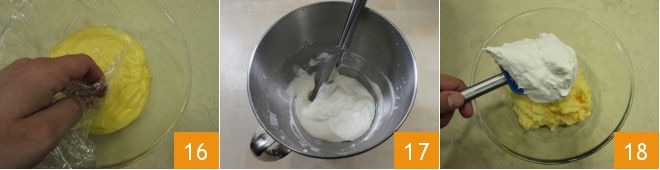 Once ready, transfer the cream to a bowl and cover with plastic wrap in contact 16 to prevent skin from forming. Once the cream is completely cold, pour the cream into the bowl of the stand mixer and when it is well whipped 17 add it to the cream, folding it gently from bottom to top 18;