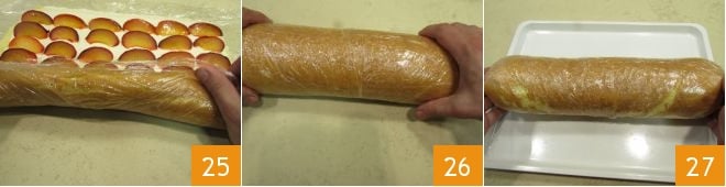 roll up the sponge cake using the plastic wrap 25, sealing the sides well, twisting them like candy, and rolling the roll tightly 26, then place the roll in the fridge and let it set for at least 2 hours 27.
