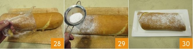 After the necessary time, remove the plastic wrap from the roll 28 and dust with powdered sugar 29, then you can slice and serve your plum roll 30.