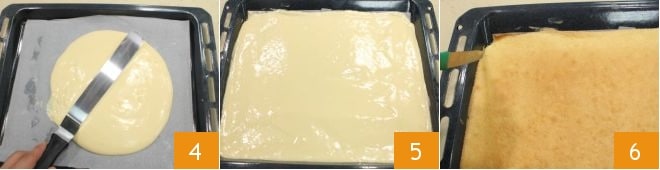 Pour the mixture onto a greased and parchment-lined 12x16 inch baking sheet and spread it with a spatula 4, leveling carefully until you get a 1/4 inch layer 5. Bake in a preheated oven at 428°F for 8-9 minutes in static mode, or at 392°F for 4-5 minutes if ventilated. Once cooked, gently detach the sponge cake with a small knife 6