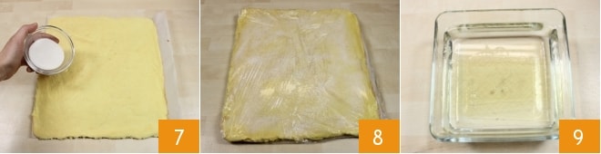 and flip it onto a work surface with the parchment paper still attached. Sprinkle with granulated sugar so it doesn't stick 7, and then cover with a clean tea towel or wrap in plastic wrap so it cools without drying out 8. Meanwhile, prepare the cream: first, soak the gelatin sheets in cold water for at least 10 minutes 9;