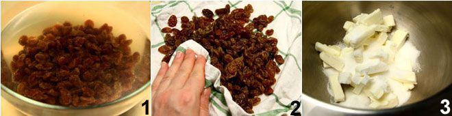 Clean the raisins and soak them in a container with hot water 1, and once softened, pat them dry with a cloth 2. Beat the eggs with 125 g of sugar using a mixer or a stand mixer; in a bowl, cream the butter with the remaining sugar 3.