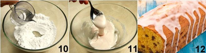 In the meantime, prepare the glaze for the plum cake by mixing the boiling water with the powdered sugar 10 until the ingredients reach the right consistency 11, then once the plum cake is unmolded, place it on the surface of the cake 12.