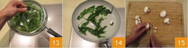 Cover the pan with a lid 13 and let it cook for a few minutes: the chard should just be wilted. Once they are ready 14, transfer them to a plate and set them aside for a moment. Now move on to the champignon mushrooms: clean them with a dry cloth to remove the dirt, then cut the more earthy end of the stem 15