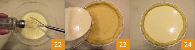 Add a pinch of salt and pepper to taste 22. At this point, take the pan with the polenta and pour in the mixture of fresh cream and eggs 23, carefully filling the polenta base 24.