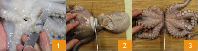 To prepare the polenta with stewed octopus and herbs, start by bringing a pot with 17.5 oz of salted water to a boil. Then proceed with How to Clean and Cook Octopus. After rinsing it under cold running water, place it on a cutting board and remove the beak: with a small knife, cut around the mouth, dig inside, and extract the beak 1. Also, remove the sack at eye level, then remove the head 2. Tenderize the octopus meat by pounding it with a meat tenderizer, a meat pounder, or a kitchen utensil for 10 minutes, to break the fibers and make the meat more tender. Rinse the octopus again under cold running water and extract the innards from the sack, then wash it thoroughly inside. Divide the octopus in half 3,