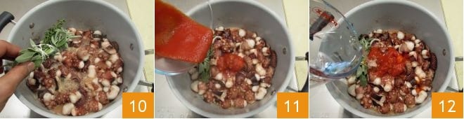 Tie all the aromatic herbs in a bundle with kitchen string and add it to the octopus 10, then also pour in the tomato puree 11 and enough water to cover the fish 12.