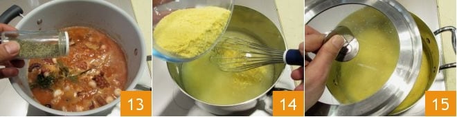 Adjust with salt and pepper 13 and cook over low heat for 30 minutes. Meanwhile, take care of the polenta. In a pot, bring salted water to a boil, then pour in the cornmeal gradually, stirring continuously with a whisk 14; mix well and cover with a lid 15: cook the polenta over low heat for 35-40 minutes, stirring it occasionally with a wooden spoon (if necessary, adding a spoonful of water). In the meantime, prepare the side dish; wash the herbs under running water, drain, and dry them.