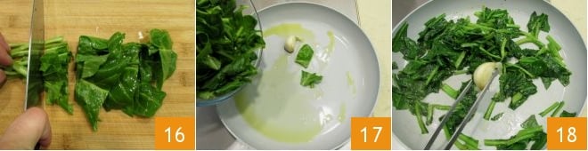 Place them on a cutting board and chop them coarsely 16, then sauté them with garlic in a pan with olive oil 17, season with salt and pepper, and cook for 5-6 minutes. Once ready, remove the garlic head 18 and keep them warm.