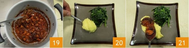 When both the polenta and the octopus are ready, remove the herb bundle from the latter 19 and place a portion of herbs and a generous spoonful of polenta on a serving plate 20. Finally, place some octopus with the cooking sauce on top of the polenta 21: your polenta with stewed octopus and sautéed herbs is ready to be served.