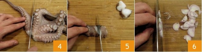 separate each tentacle 4 and cut them together with the head into cubes and strips 5. Clean and slice the shallot into thin rings 6.