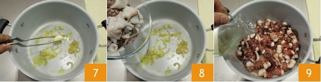 In a non-stick pot with olive oil, place a garlic head and the shallot to fry; when it's well browned, remove the garlic 7. Add the octopus and let it brown for 4-5 minutes 8, then deglaze with white wine 9.