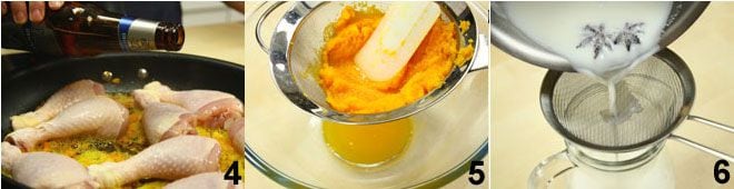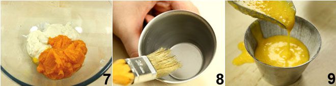 Mix the carrot puree with the béchamel sauce 7, then also incorporate the whole eggs and the two yolks and blend everything. Butter and flour 4 molds 8, pour the mixture into them 9 and bake in the oven at 320°F for 60 minutes. Finally, serve the dish by placing the chicken on a bed of vegetables, sprinkle with the cooking juices, and serve accompanied by the carrot flan.